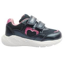Cute girls runners from Geox Shoes in a navy/pink upper with heart design. These shoes feature a convenient double velcro strap closure for easy on and off while keeping the shoe secure on the foot. Geox has crafted these shoes with perforated rubber soles and a membrane designed to absorb and expel sweat while preventing water from entering. The removable insole features a handy check your feet size guide which ensures a perfect fit, allowing you to monitor your childs growing feet with ease & accuracy.