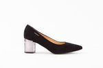 A Classic court shoe from Bioeco by Arka. This style has a soft black shade in a suede upper .The shoes has a breathable cushioned leather insole with a Softstep system and a patterned covered block heel. It also has a rounded toe and some elastic on the rim for improved fit.
